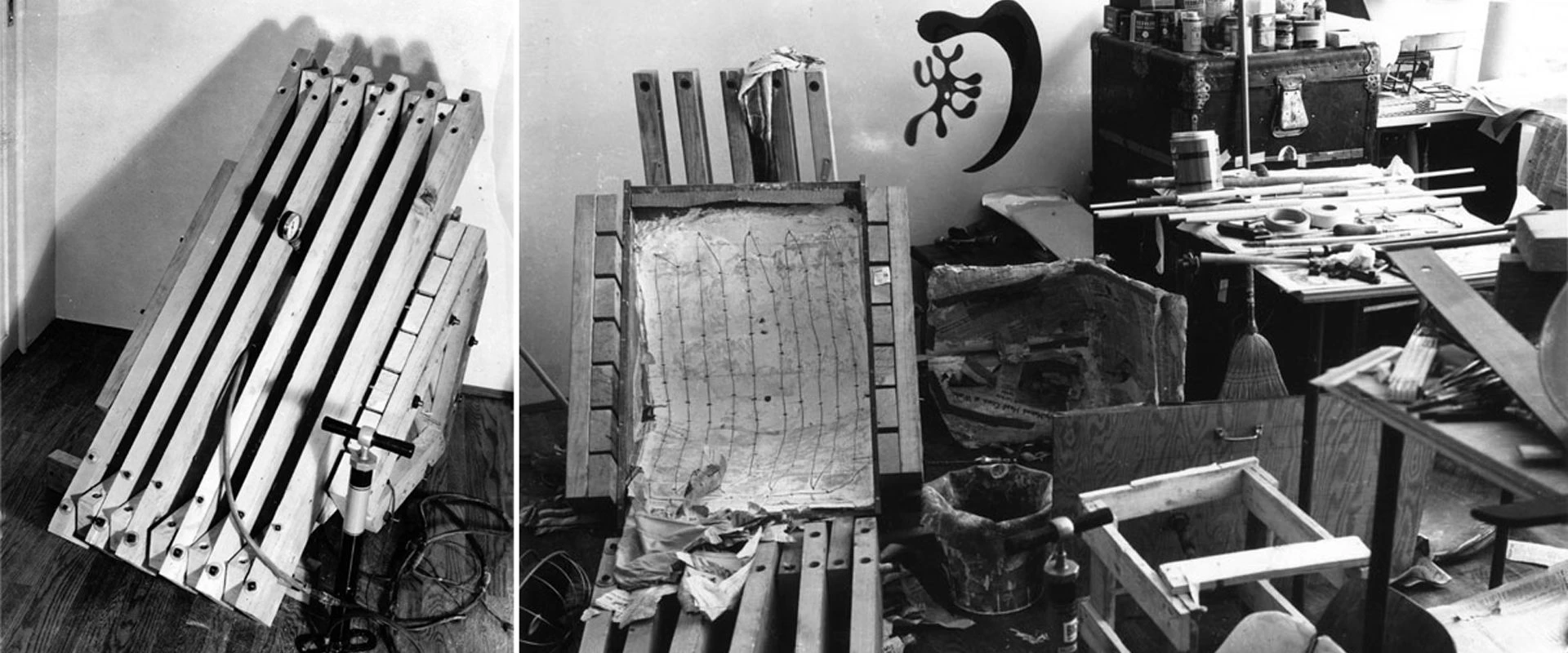Many of these designs were ultimately unrealized commercially, but the deep involvement in the development process—a perpetual cycle of ambition, experimentation, and refinement—catapulted the Eameses and their cohort to an unrivaled level of technical mastery. During this time, Ray and Charles further solidified an ethos that would guide their work for decades to come: removing, to the greatest extent possible, any marks of artistic self-expression in an effort to eliminate idiosyncrasies that get magnified in mass production, and distract from the purpose of the design. There is, in hindsight, some irony to this: the pair created what any impartial observer would deem sculptures in an effort to better understand and push the limits of their molding capability (as well as three known examples of sculptures carved from splints themselves). Nonetheless, through the lens of time and removed from its original purpose, a factory-produced splint is in and of itself a work of art. This beauty in utility was undoubtedly not lost on Ray and Charles—a remarkable series of photographs by Herbert Matter portrays airplane fuselage sections as monumental sculptures better suited to the halls of MoMA than a military hangar.