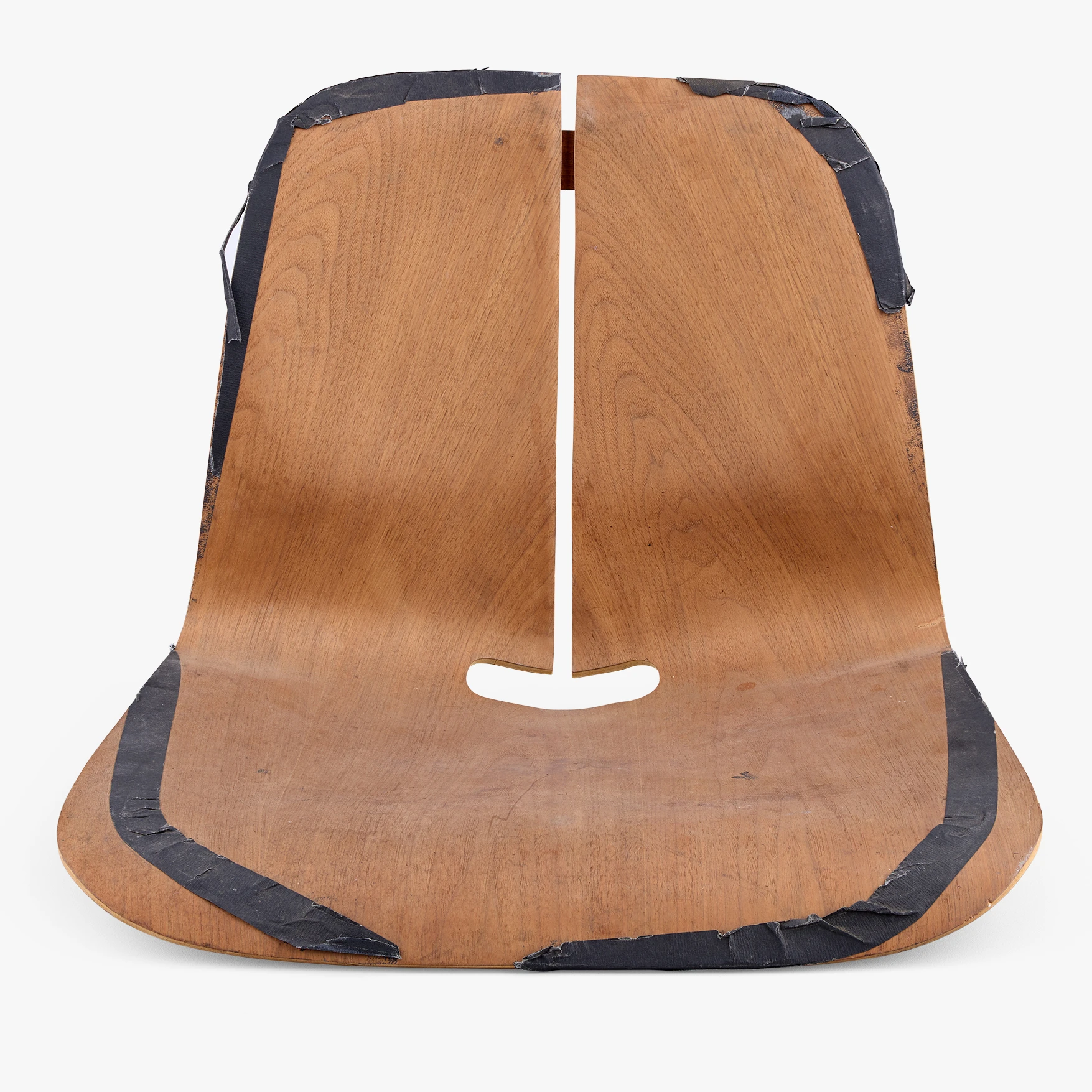 The designers tested a number of configurations, including a ribbon shape and bucket shape, a saddle seat, and a split-back one-piece shell, which is the shape of this prototype. The bottom of this chair shows three attachments for legs, though the final design included four for increased stability.