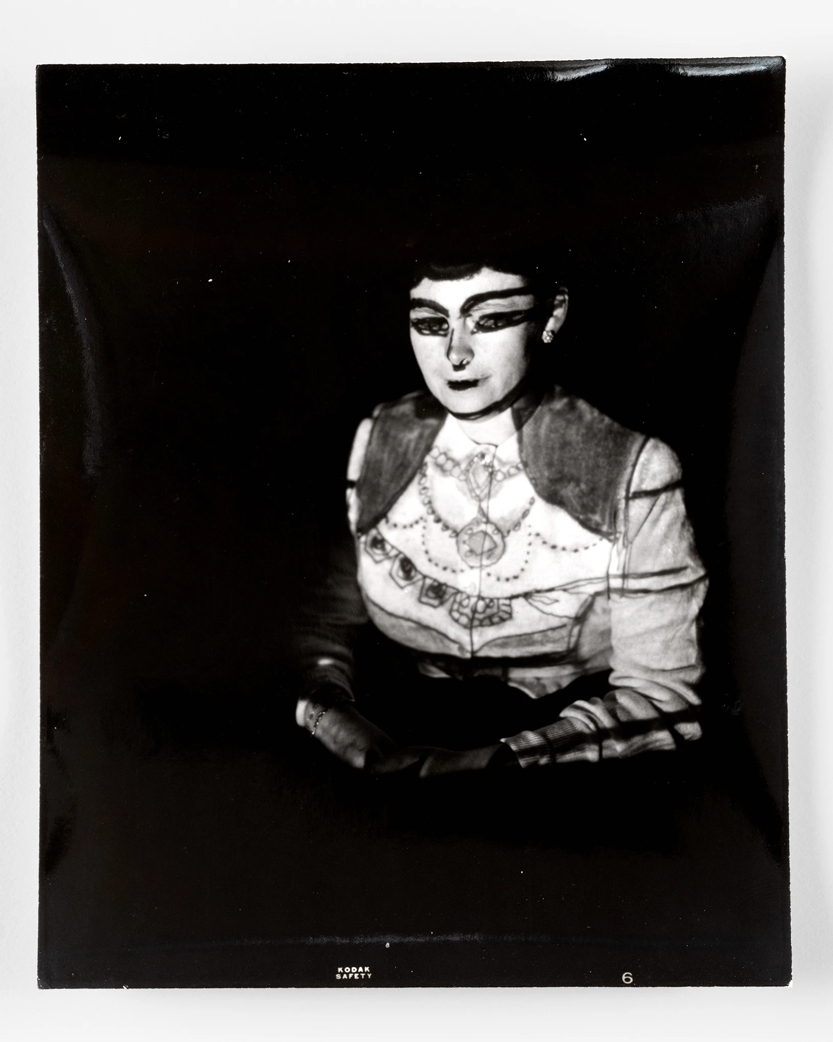 This photograph is one of a series in which a Saul Steinberg drawing of a woman was projected onto Hedda Sterne. Here, the projection aligns so closely with Sterne’s own features that it becomes a mask of sorts. This anticipates the paper-bag masks that Steinberg would begin making several years later. Between 1959 and 1962, he animated many simple paper bags with faces drawn in crayon, ink, or pencil, which he and his friends then donned for masked portraits taken by photographer Inge Morath. The Eameses shared Steinbergs' interest in masks. They began collecting masks from around the world in the 1940s and in 1950 they designed a range of oversized animal masks for children and adults, which subsequently made appearances as props and decorations in photo shoots, exhibitions, and staged rooms.