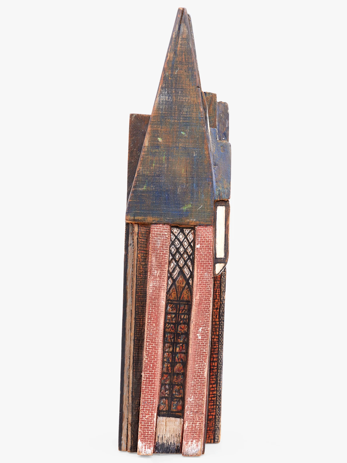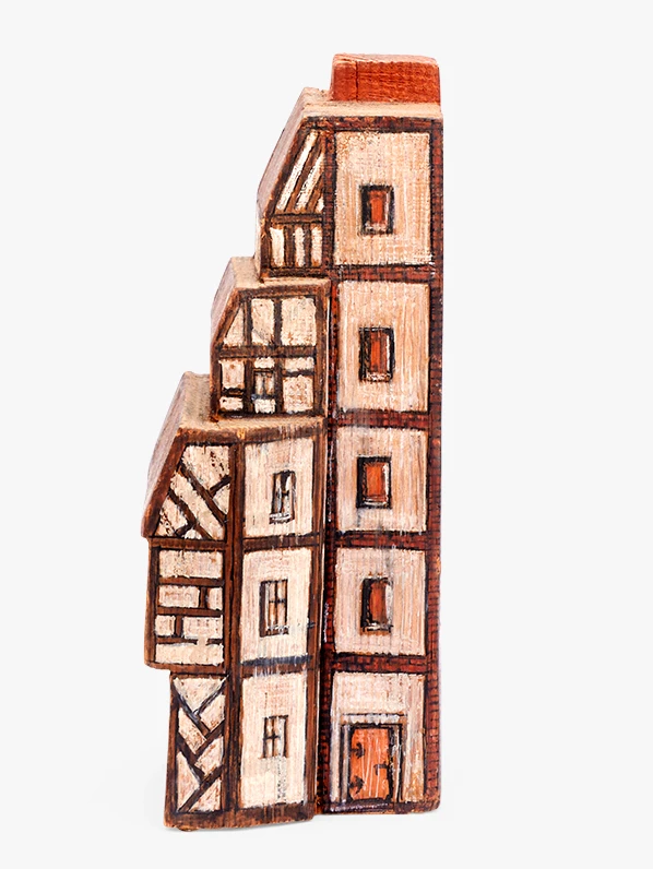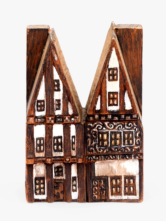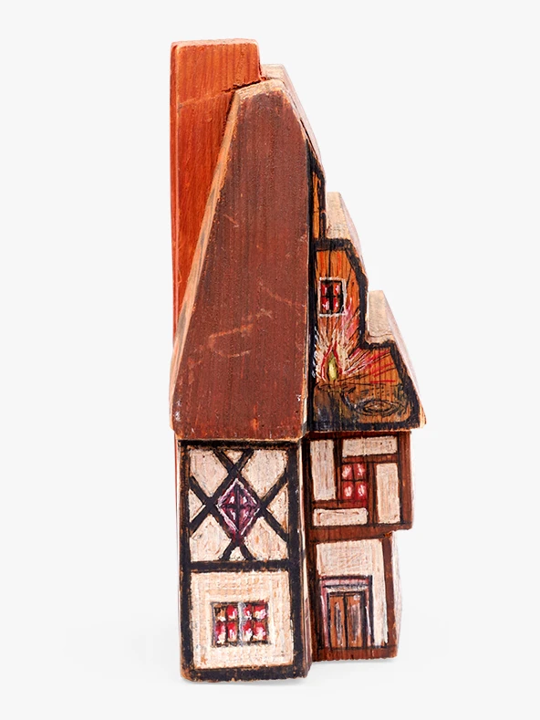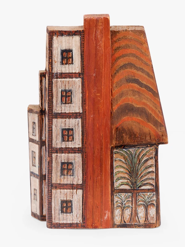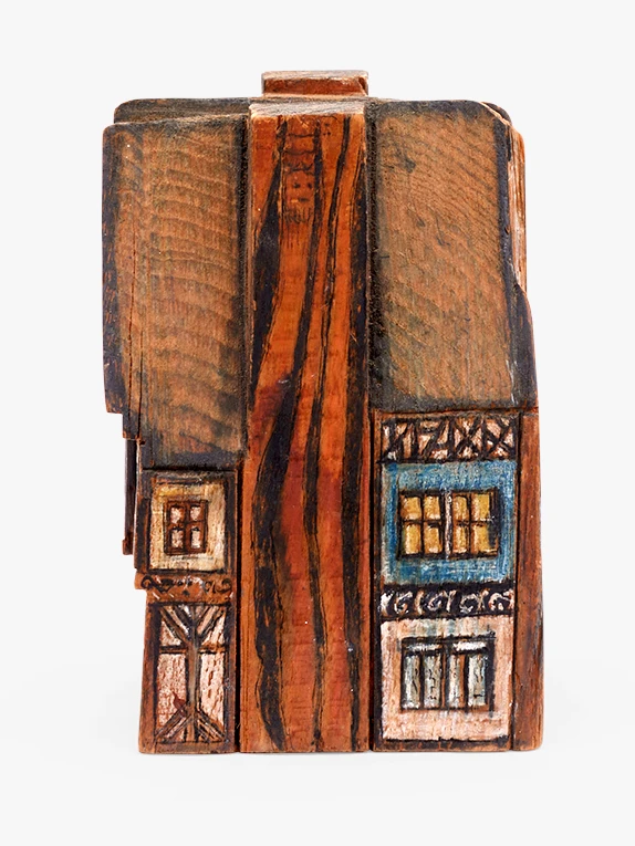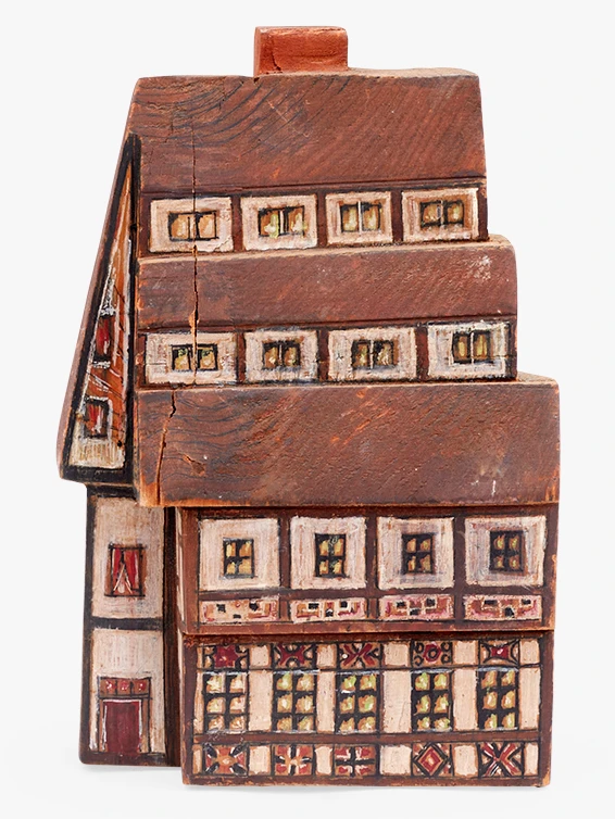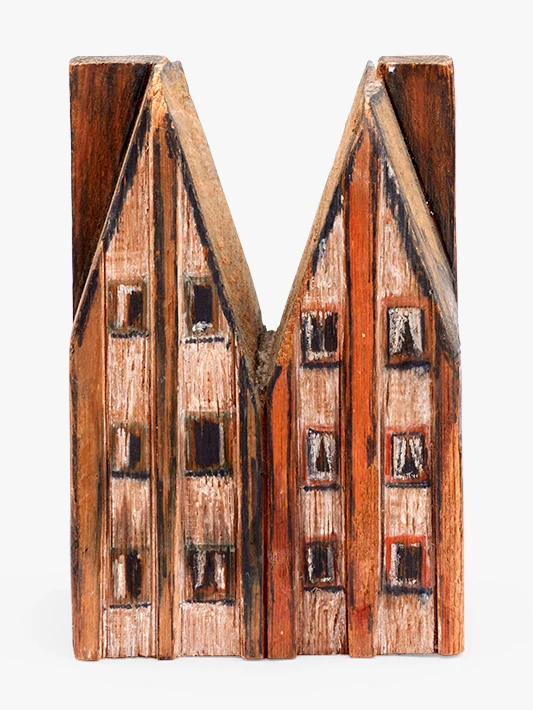 This collection of miniature wooden buildings was used for one of the sets in Toccata for Toy Trains, a film made by the Eames Office in 1957. The term “toccata” refers to a musical composition intended to show off a player’s virtuosity. In the case of the Eames film, toy trains became the performers against a score by Elmer Bernstein. Trains dash through intricate sets populated by a cast of dolls and other toys. This collection of more than two dozen unique buildings was used for a scene in which a train passes through a quaint village. The buildings’ steeply pitched roofs and wood-decorated façades suggest a rustic European setting, and although the carved wood is intricately painted with shuttered windows, brick chimneys, and other details, in many places its underlying wood grain shows through, reflecting a line from the film’s opening narration: “In a good old toy there’s apt to be nothing self-conscious about the use of materials. What is wood is wood. What is tin is tin. What is cast is beautifully cast. It is possible that somewhere in all this is a clue to what sets the creative climate of any time, including our own.”