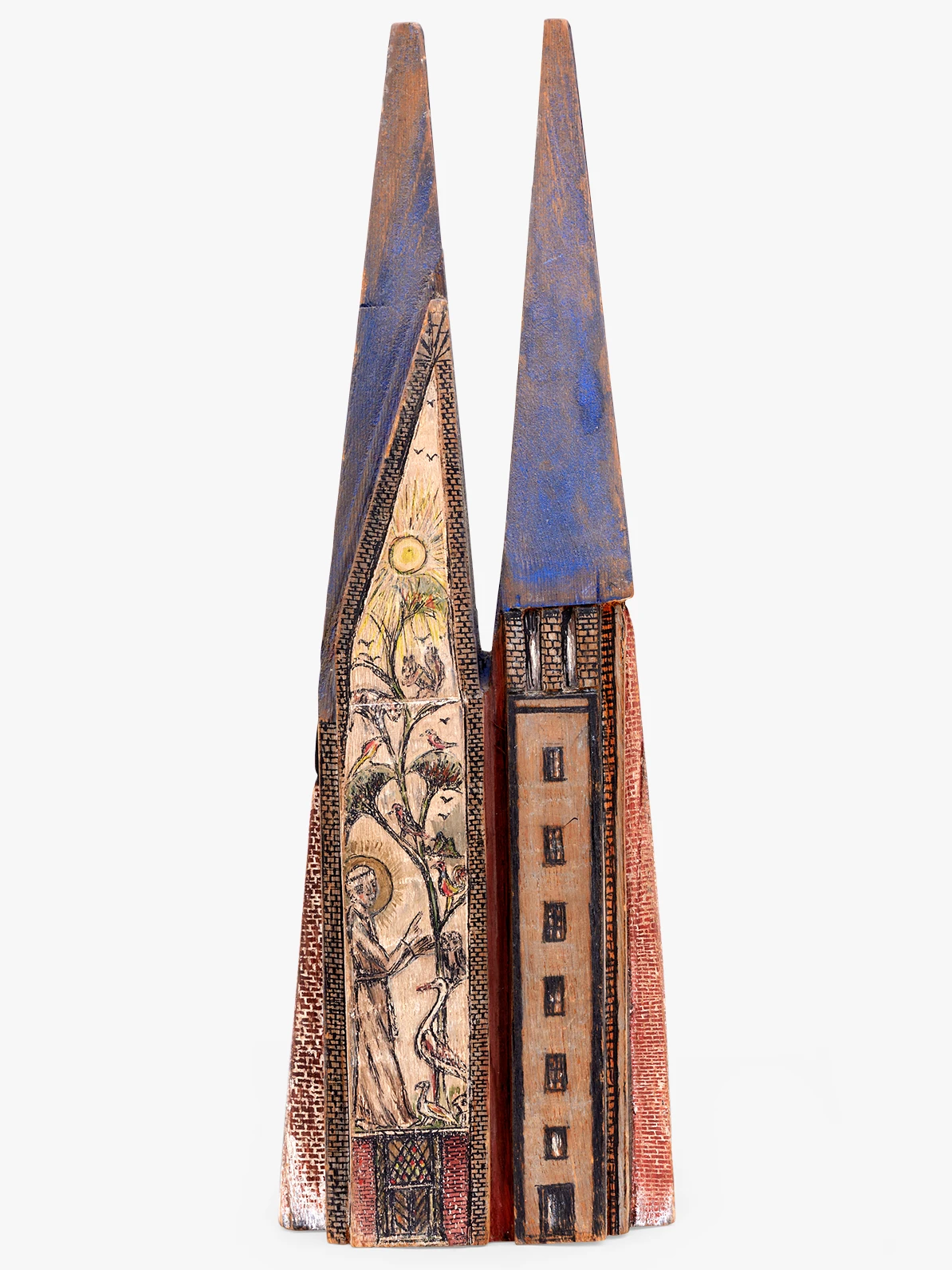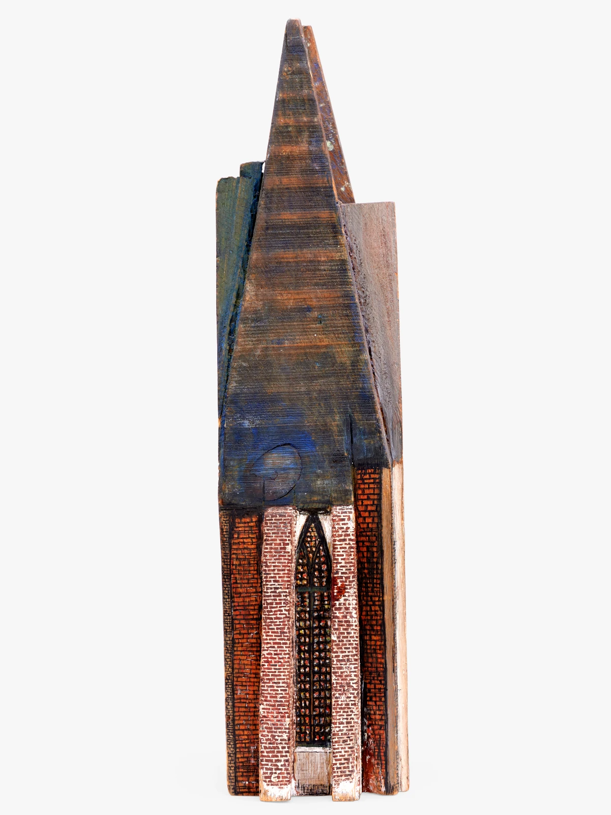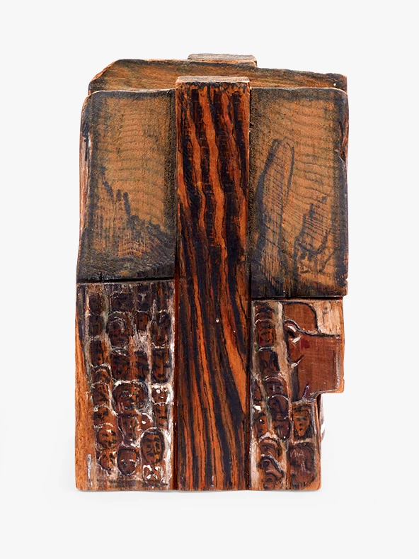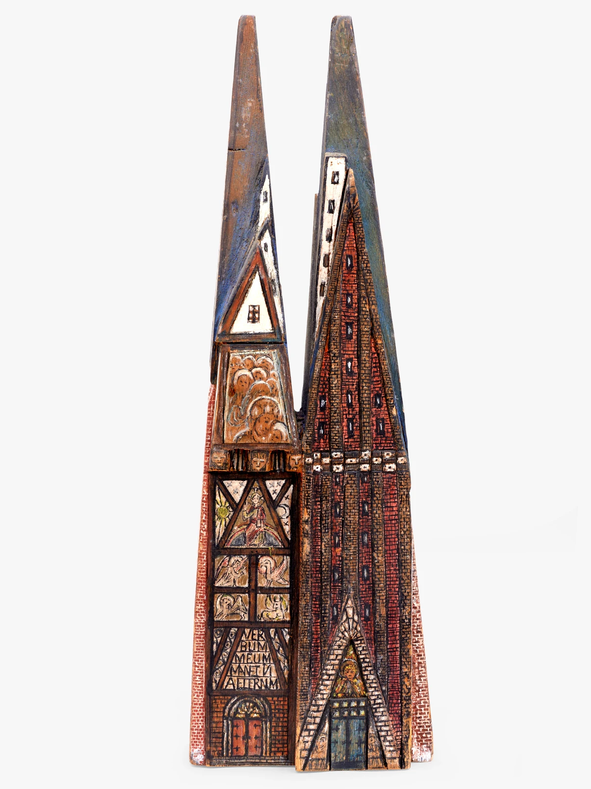 This collection of miniature wooden buildings was used for one of the sets in Toccata for Toy Trains, a film made by the Eames Office in 1957. The term “toccata” refers to a musical composition intended to show off a player’s virtuosity. In the case of the Eames film, toy trains became the performers against a score by Elmer Bernstein. Trains dash through intricate sets populated by a cast of dolls and other toys. This collection of more than two dozen unique buildings was used for a scene in which a train passes through a quaint village. The buildings’ steeply pitched roofs and wood-decorated façades suggest a rustic European setting, and although the carved wood is intricately painted with shuttered windows, brick chimneys, and other details, in many places its underlying wood grain shows through, reflecting a line from the film’s opening narration: “In a good old toy there’s apt to be nothing self-conscious about the use of materials. What is wood is wood. What is tin is tin. What is cast is beautifully cast. It is possible that somewhere in all this is a clue to what sets the creative climate of any time, including our own.”
