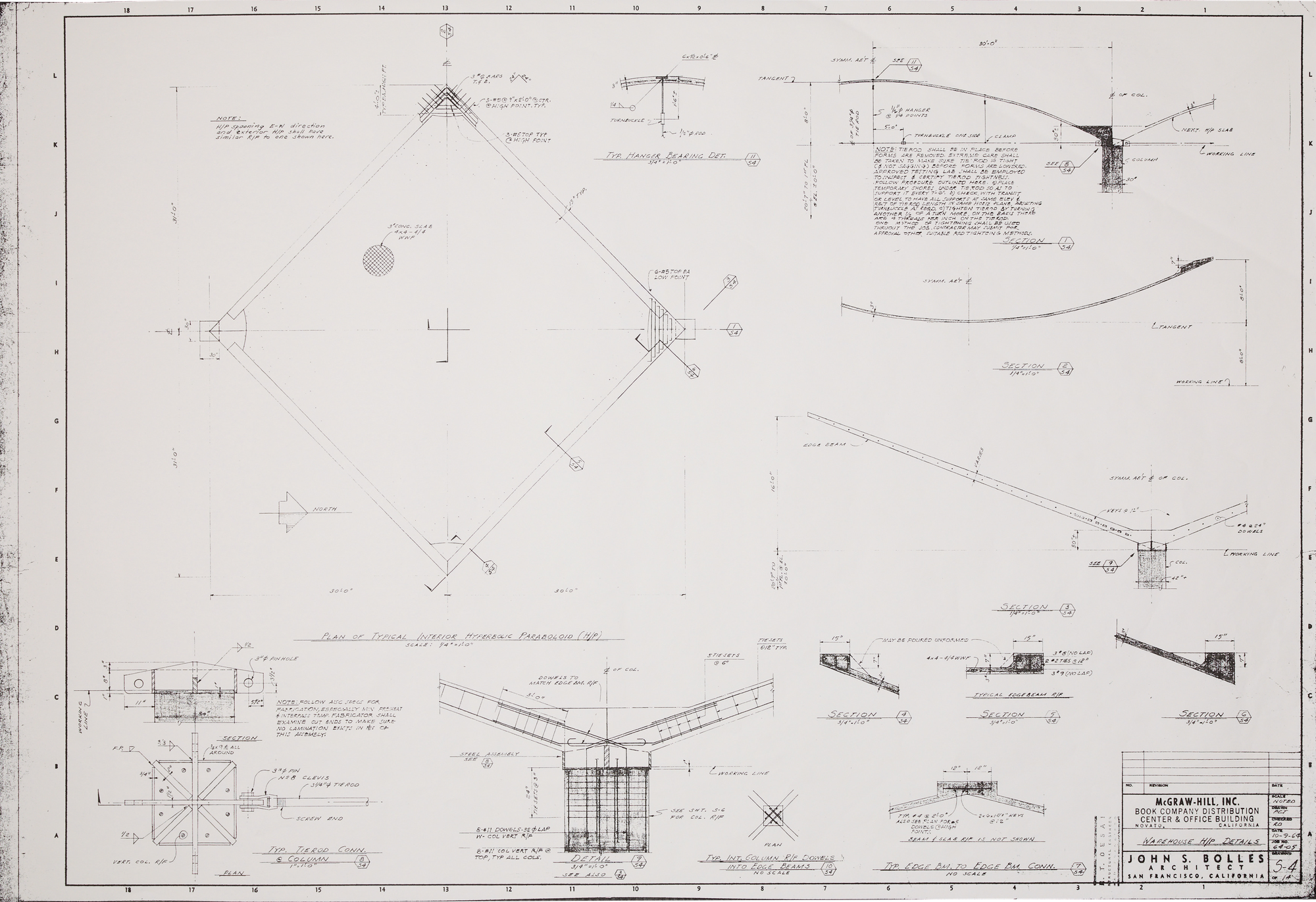 Architectural drawing of details of the hyperbolic paraboloid roof by John S. Bolles, 1964. Artifact # A.2025.3.010