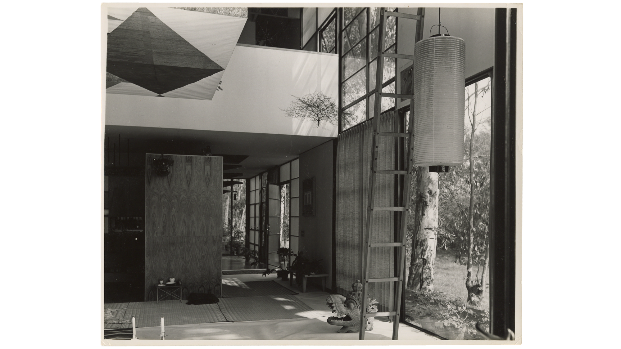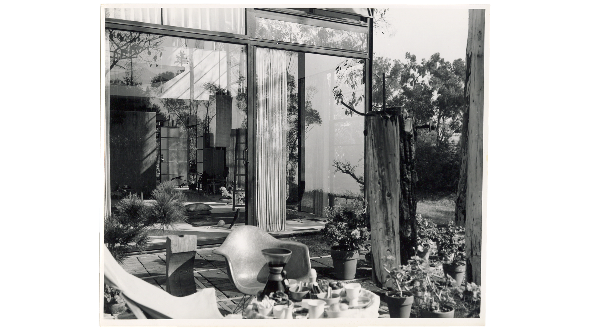 Charles and Eero Saarinen created the original Eames House design that Ray and Charles significantly modified beginning in 1947; the couple did so to integrate the structures much more elegantly into the existing landscape and horticultural features. As their daughter Lucia recalled, they had grown to adore the meadow as they explored and picnicked there before beginning construction, and among other adjustments, they rotated the building’s original plan by 90 degrees in order to preserve the meadow. The project description that appeared in Arts & Architecture magazine noted, “The house must make no insistent demands for itself, but rather aid as background for life in work. The house—in its free relation to the ground, the trees, the sea—with constant proximity to the whole vast order of nature acts as re-orientor and ‘shock absorber’ and should provide the needed relaxation from the daily complications arising within problems.”