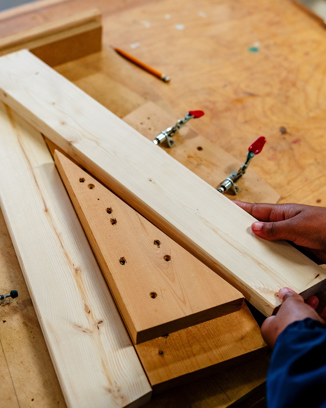 Lauren Bridges, who is 17 and now in 11th grade, began working in the Maker Space this year. Her friends in the program told her how fun it was, so she wanted to see for herself. In just a few months’ time, she’s built an outdoor classroom, Ishinomaki benches, and desks that were donated to the Detroit Leadership Academy to help with online learning during COVID-19. “The woodshop is amazing to me,” she says. “I like that we all work as a team. If someone doesn’t know what they’re doing and needs help, we can ask each other to figure out what we need to do. At some jobs, everybody doesn’t get along. Here, none of us have an attitude, we get along, it’s fun.” That spirit of camaraderie was put to the test when Bridges recently learned how to make an Ishinomaki bench. “When I first saw the bench, I thought it was going to be hard to make,” Bridges says. “But after Walt went through the steps, I thought it was pretty easy. I’m proud of myself for actually building it since I didn’t think I was going to be able to.” One weekend in December, Bridges’s grandfather, who builds furniture as a hobby and now lives in New Mexico, visited the Maker Space and helped sand wood and get a few desks started. “I was excited he came since I wanted him to see what I can do,” Bridges says. “I never thought I was going to do any of this kind of work, but it really feels like something I will be doing for the rest of my life.” Bridges thinks she might pursue furniture making professionally after she graduates.