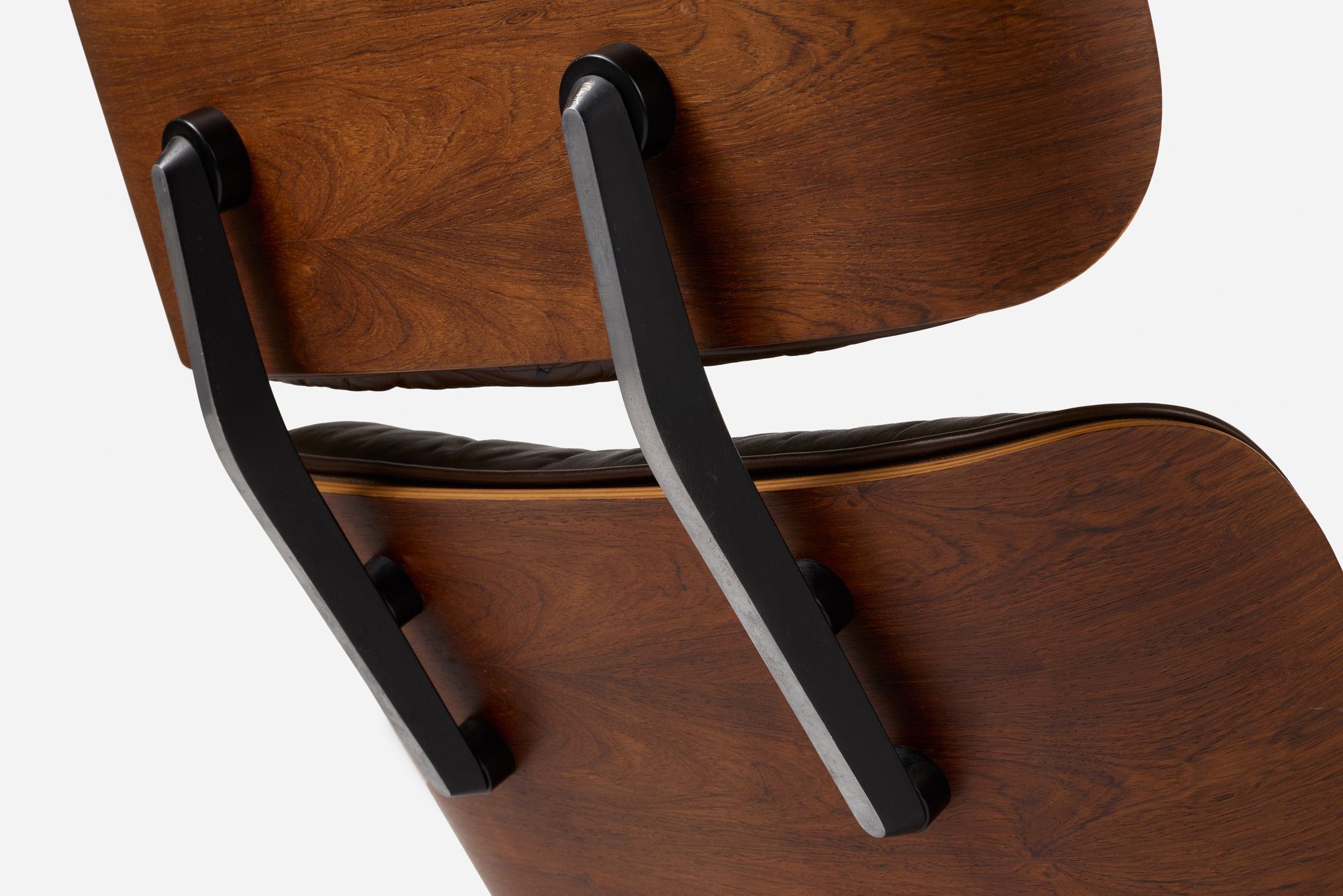 For the first product brochure Ray and Charles Eames wrote, “The upholstered lounge chair and ottoman are a combination intended to give comfort for long periods of time such as reading or conversation after dinner or just relaxing and thinking. Size and relationships of the parts are most important…all of the parts are allowed a bit of movement in relation to each other.”