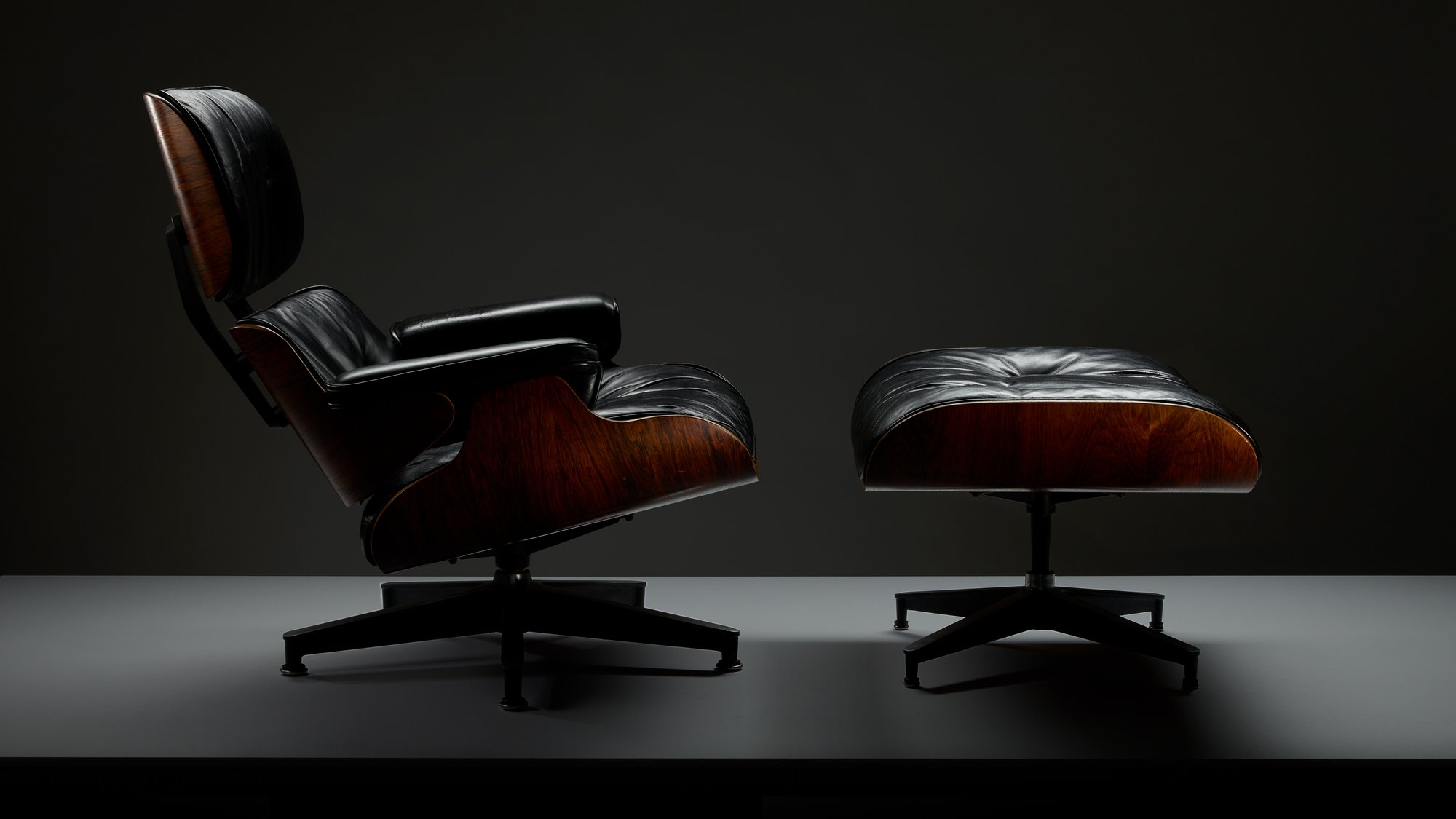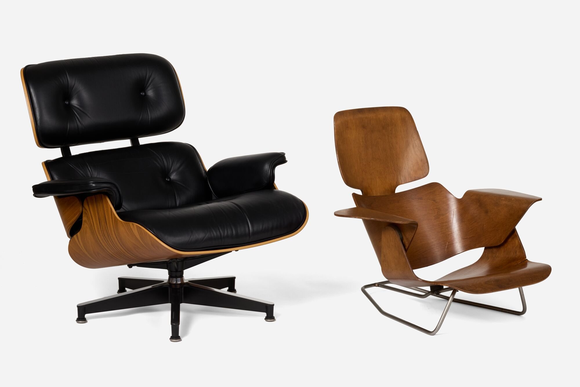A 50th anniversary edition of the Eames Lounge Chair in a sustainable Palisander rosewood veneer (left) alongside an early prototype (right). Artifacts# 2019.2.193.1 and G.2025.62.1