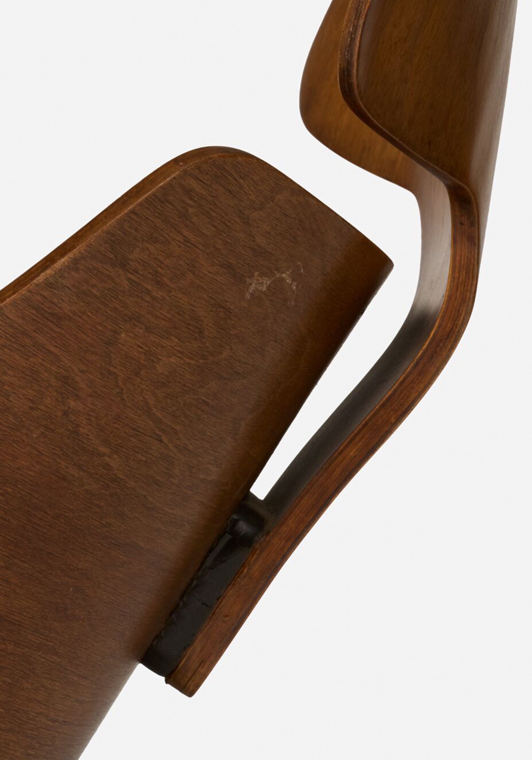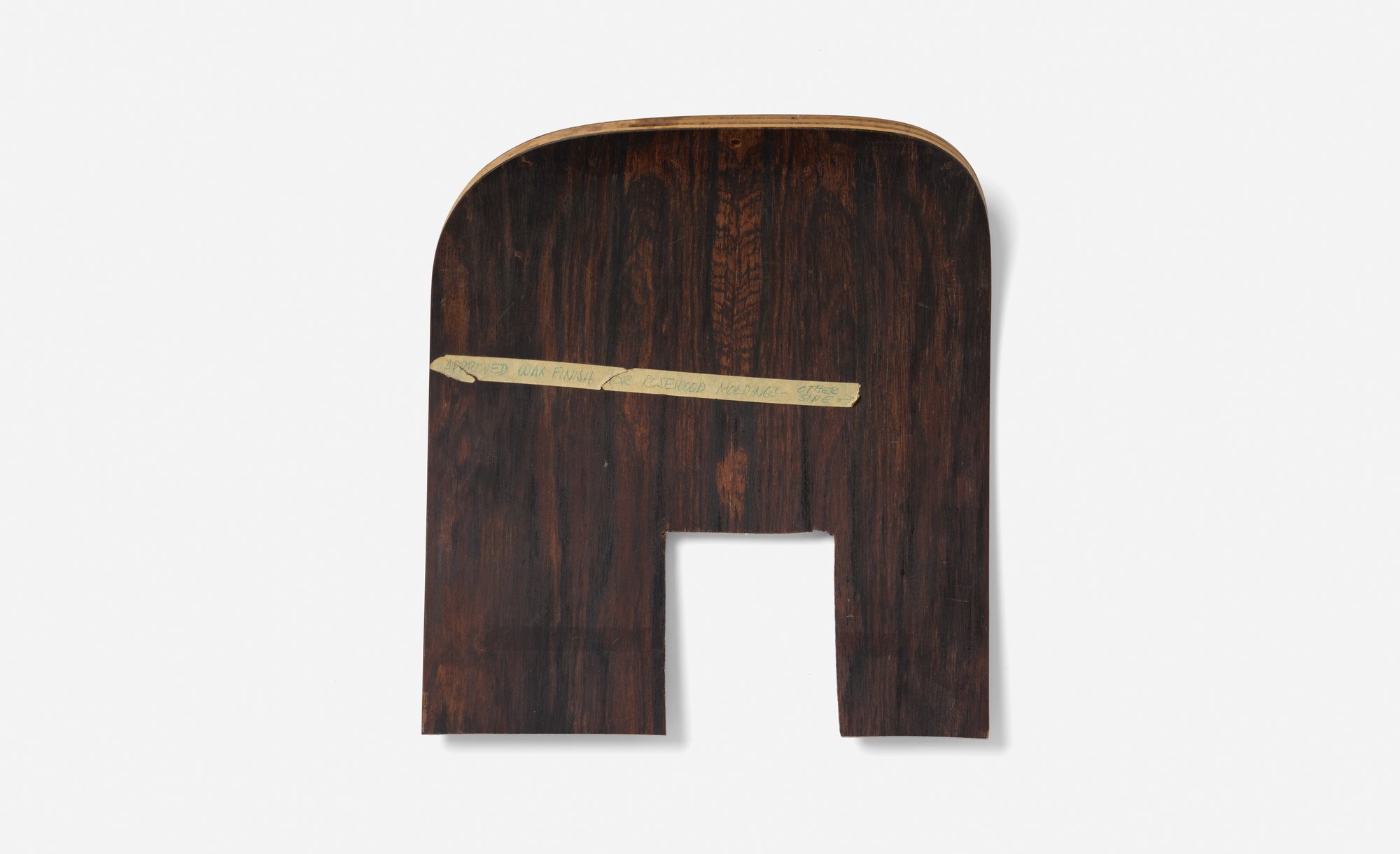In an August 1955 letter to Charles, who was then in Paris, Ray explains the iteration of the back support. She writes that she “had Don (Albinson) try many back connections and it is now two thin cast triangular sections. Trim, neat, undesigny but cared for, rather than hunks or straps and relation, but no conflict with the base.” Together, the wooden part and the letter show two sides of the same process: the object itself, and the thinking that continued to revise it. (To read the full letter, see page 142 of An Eames Anthology.)